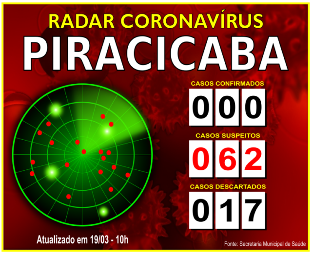 Por meio de sua página na rede social Facebook, o prefeito Barjas Negri comunicou que, às 10 horas desta quinta-feira (19), o número de casos suspeitos de coronavírus (COVID-19) aqui em Piracicaba aumentou para 62 de ontem para hoje, sendo que 17 continuam descartados. Até ontem (dia 18), o município registrava 32 casos suspeitos. Apesar do número praticamente dobrar em 24 horas, nenhum caso de coronavírus ainda foi confirmado aqui em Piracicaba.