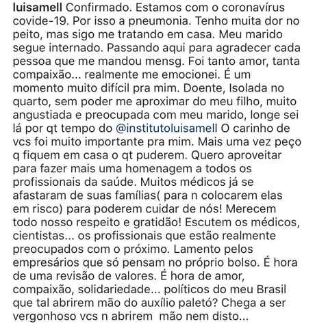 “Confirmado. Estamos com o coronavírus covide-19. Por isso a pneumonia. Tenho muita dor no peito, mas sigo me tratando em casa. Meu marido segue internado. Passando aqui para agradecer cada pessoa que me mandou mensagem. Foi tanto amor, tanta compaixão… realmente me emocionei”, escreveu.