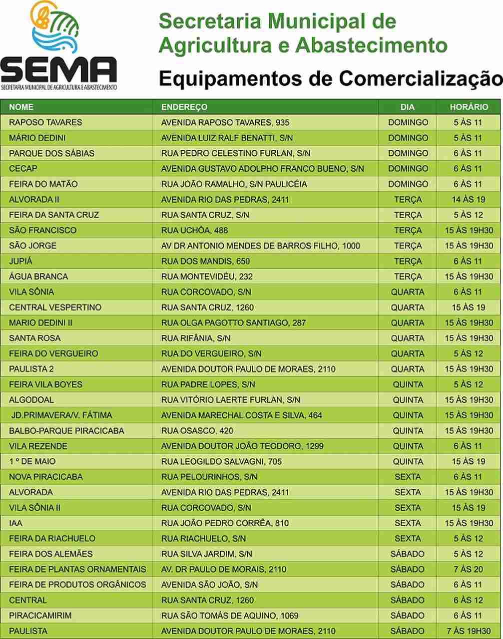 Em meio à pandemia de coronavírus (COVID-19) que tem preocupado todo mundo, a Prefeitura de Piracicaba, por meio da Sema (Secretaria Municipal de Agricultura e Abastecimento), informou nesta terça-feira (24) que os varejões municipais permanecerão abertos. A tabela de funcionamento, divulgada pela própria Sema, já pode ser conferida abaixo.
