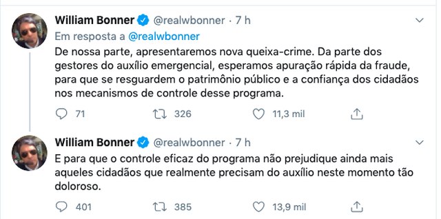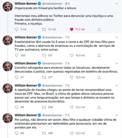 “Estelionatários têm usado há 3 anos o nome e o CPF de meu filho para fraudes, como a abertura de empresas ou a contratação de serviços de TV por assinatura, entre outras. Constituí advogados para encerrar todas as falcatruas, devidamente denunciadas à polícia, com queixas registradas em boletins de ocorrência. A repetição de fraudes chegou ao ponto de tornar recomendável uma troca do CPF”, disse William Bonner em um dos tuítes.