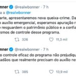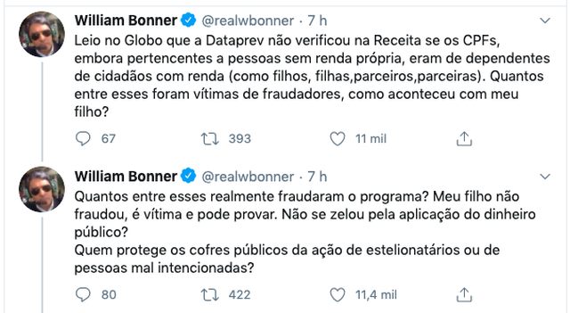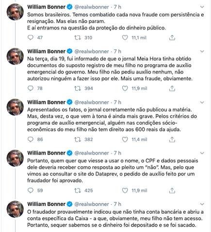 Na sequência de tuítes feitos pelo âncora da Globo, Bonner conta que o mais recente golpe sofrido pelo filho foi a inscrição do CPF de Vinícius Bonemer no programa de auxílio emergencial do Governo Federal. “Na terça, dia 19, fui informado de que o jornal Meia Hora tinha obtido documentos do suposto registro de meu filho no programa de auxílio emergencial do governo. Meu filho não pediu auxílio nenhum, não autorizou ninguém a fazer isso por ele”, revelou.
