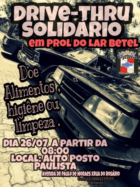 No domingo, dia 26, o Clube do Opala e Caravan de Piracicaba realizará um Drive-Thru em prol do Lar Betel da cidade. A ação beneficente terá início às 08h, no Auto Posto Paulista, situado na esquina da Avenida Doutor Paulo de Moraes com a Rua do Rosário.