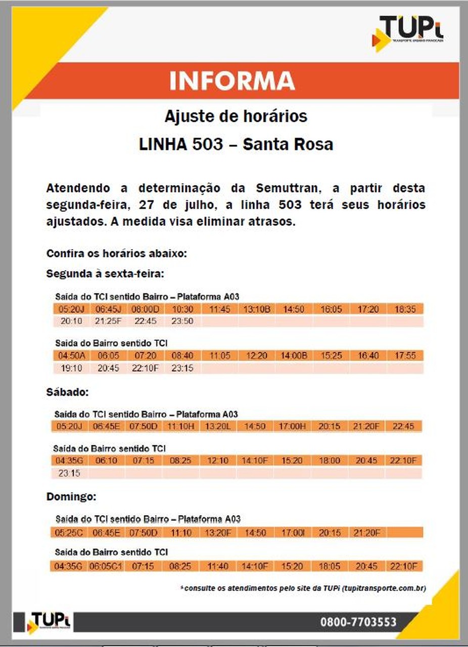 A TUPi (Transporte Urbano de Piracicaba) informou, na tarde desta sexta-feira (24), que promoveu alguns ajustes no horário da Linha 503, responsável por atender o bairro Santa Rosa. Segundo a TUPi, os ajustes começam a vigorar já na próxima segunda-feira (27) e visa eliminar atrasos. Confira abaixo todos os detalhes.