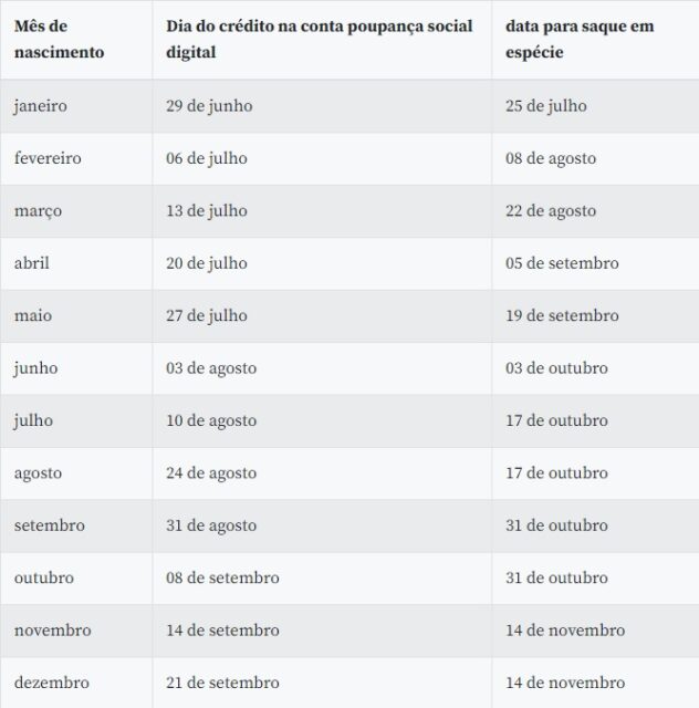 O dinheiro só será liberado para saque ou transferência para outra conta bancária a partir de 03 de outubro, para os trabalhadores nascidos em junho. O calendário de crédito na conta poupança digital e de saques foi estabelecido com base no mês de nascimento do trabalhador.