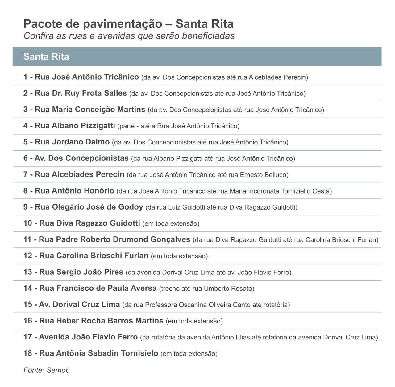 A Prefeitura de Piracicaba assinou contrato para um pacote de obras de pavimentação de 18 ruas e avenidas do bairro Santa Rita. A empresa vencedora é a Pontuali Construtora e Engenharia e o investimento é R$ 3.971.759,11 reais — valor resultante de economia de pacote anterior, de R$ 20 milhões, financiados via PAC (Programa de Aceleração do Crescimento), usado para pavimentar outras ruas do Santa Rita, do Vila Maria, Glebas Natalinas, Glebas Aliança, Gran Park e Lago Azul.