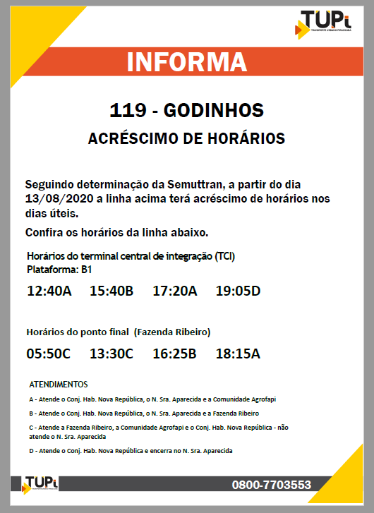A TUPi (Transporte Urbano de Piracicaba) informou, nesta semana, que promoveu acréscimos de horários em duas linhas de ônibus do município: na Linha 119-Godinhos e também na Linha 811-Anhumas. As alterações já podem ser conferidas abaixo.