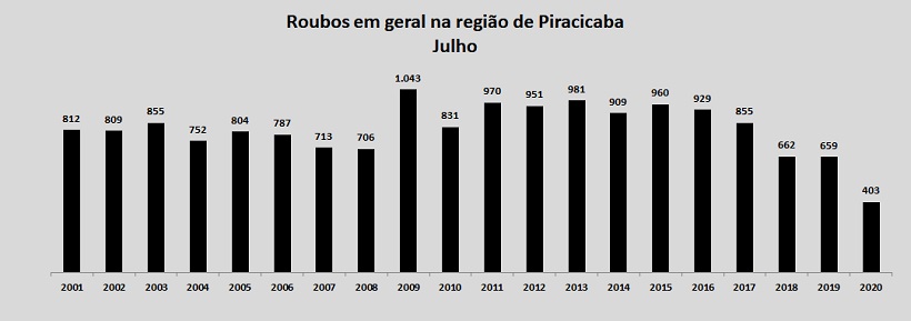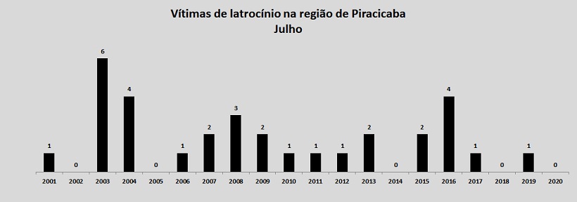 A região de Piracicaba terminou o mês de julho sem nenhum caso de latrocínio, informou a Secretaria de Segurança Pública do Estado de São Paulo. Além disso, também houve queda nos roubos/furtos em geral, de veículos e nos roubos de carga. Os roubos a banco e extorsões mediante sequestro permaneceram sem nenhum registro.