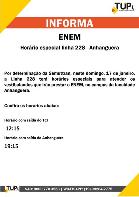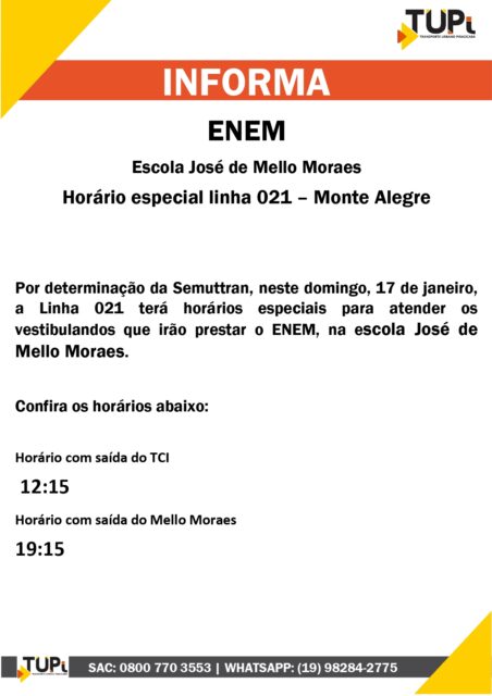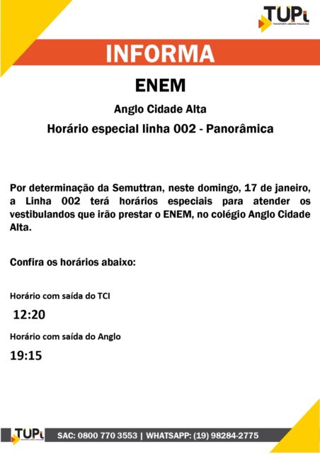 Nos domingos, 17 e 24 de janeiro, muitos estudantes vão fazer as provas do Exame Nacional do Ensino Médio (Enem) 2020. Segundo a Prefeitura da cidade, a Semuttran e a TUPi disponibilizarão linhas especiais para os estudantes que participarão do ENEM.