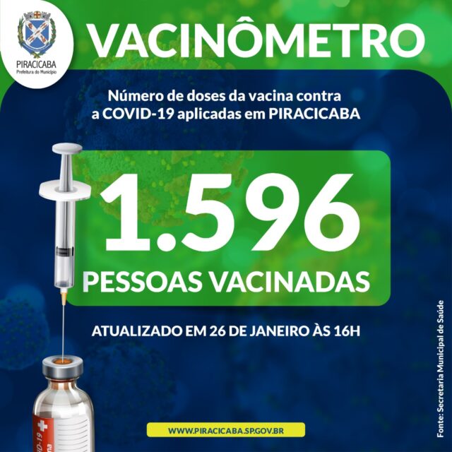 Em Piracicaba, o Vacinômetro produzido pelo Centro de Comunicação Social (CCS) da Prefeitura, com base em dados da Vigilância Epidemiológica (VE), marca que 1.596 pessoas já receberam a primeira dose da vacina contra a Covid-19 desde quinta-feira (21), quando iniciou a campanha oficial de imunização na cidade, envolvendo profissionais de UPAs, SAMU, Hospitais e VE, além das ILPIs.