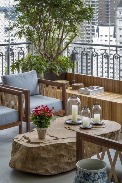 2 – ESCOLHA UM ESTILO: Se você prefere a decoração de uma varanda de forma rústica, é melhor investir em elementos confeccionados com madeira. Agora, se a sua preferência for voltada a algo sustentável, busque por artigos produzidos com fibras naturais, por exemplo.