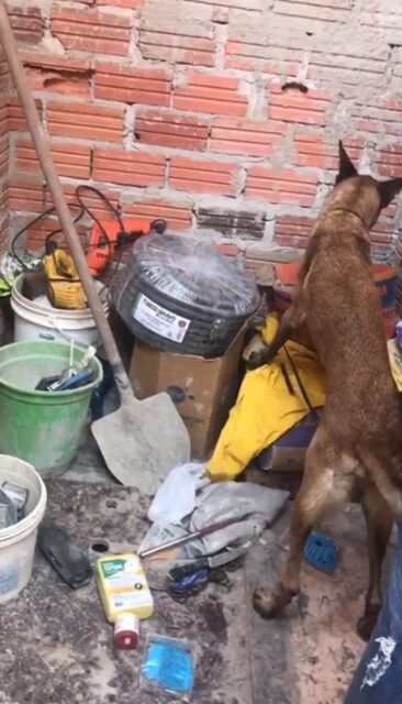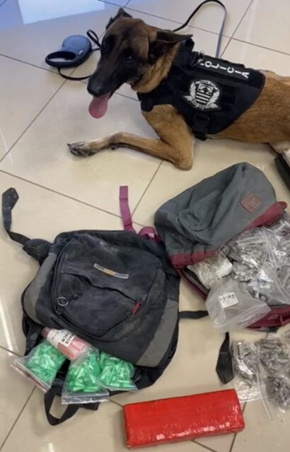 Com a ajuda do cão de faro EAGLE, da 2ª DISE – DEIC, os policiais civis encontraram um tijolo e meio de maconha, 351 porções de maconha, 180 porções de cocaína, 26 porções de skank, materiais para embalo e 5 balanças de precisão.