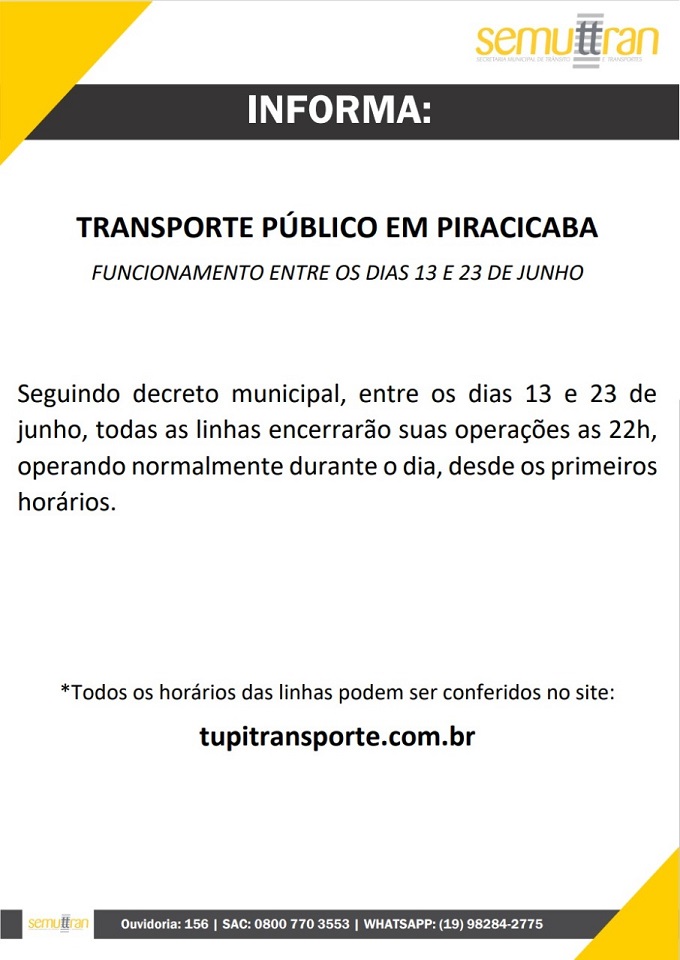 Entre as mudanças, está o horário de funcionamento do transporte coletivo da cidade, que agora encerrará às 22h. Confira abaixo o comunicado na íntegra da Semuttran: