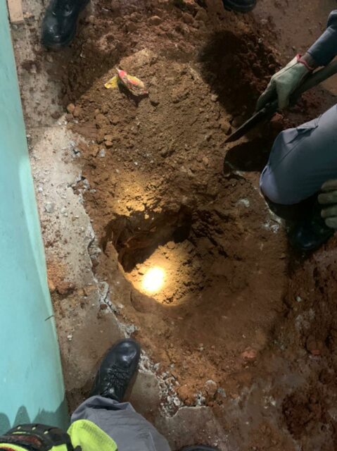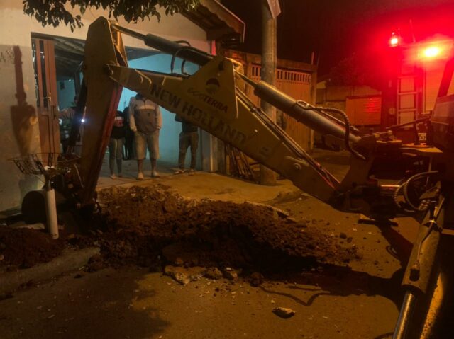 A única solução encontrada foi acessar a tampa do esgoto pelo lado de fora da residência, onde foi solicitado apoio de uma máquina retroescavadeira da Ecoterra. Após cinco horas de trabalho, o comandante sargento Ferreira, cabo Lopes, soldado Luciano e soldada Júlia obtiveram êxito na retirada do animal, que foi entregue com vida aos cuidados da tutora.