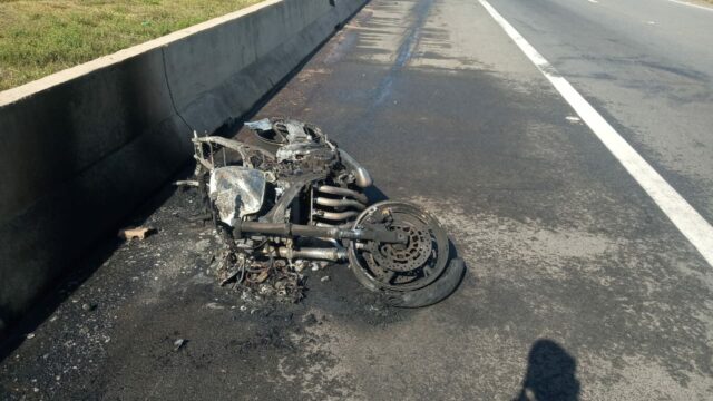 Em Campinas (SP), neste sábado (03), uma motocicleta pegou fogo após tombar no Anel Viário Magalhães Teixeira, a SP-083, pista norte. As causas são desconhecidas.