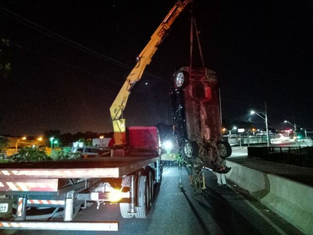 Depois da colisão, o I30 caiu no rio e foi retirado por um guincho nesta madrugada (05). O motorista teve ferimentos leves.