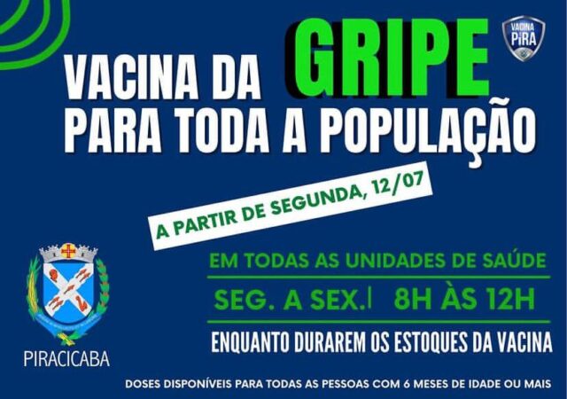 A Prefeitura de Piracicaba (SP) liberou a ampliação da Campanha Nacional de Vacinação contra a Influenza 2021 para todas as faixas etárias a partir de 06 meses de idade. A partir da próxima segunda-feira, 12 de julho, toda população piracicabana poderá se vacinar em qualquer uma das unidades de saúde da cidade, de segunda a sexta-feira, das 08h às 12h.