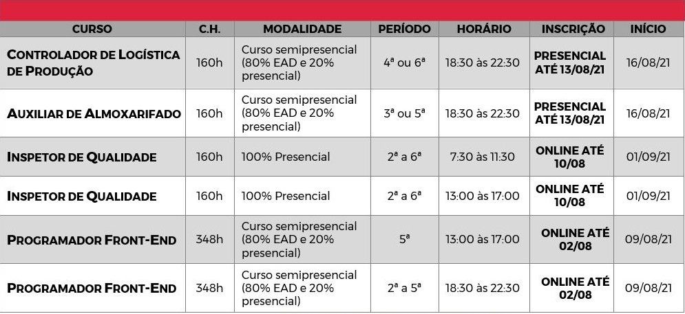 Os cursos Controlador de Logística de Produção, Auxiliar de Almoxarifado e Programador Front-End serão semipresenciais, o aluno vai até a escola um dia por semana e o restante da semana será pela plataforma EAD. Para estes cursos é necessário que o aluno tenha computador e acesso à Internet.