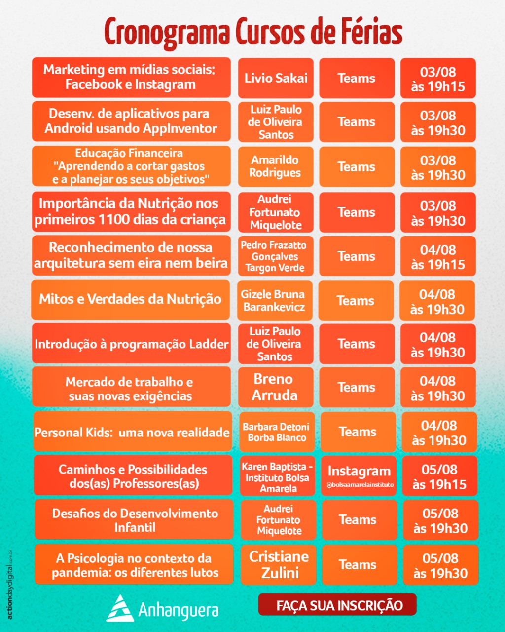 A Faculdade Anhanguera de Piracicaba (SP) oferece novos cursos de férias gratuitos para aqueles que buscam novas oportunidades no mercado de trabalho. As capacitações acontecem entre os dias 03 a 05 de agosto. Confira mais abaixo os cursos disponibilizados.