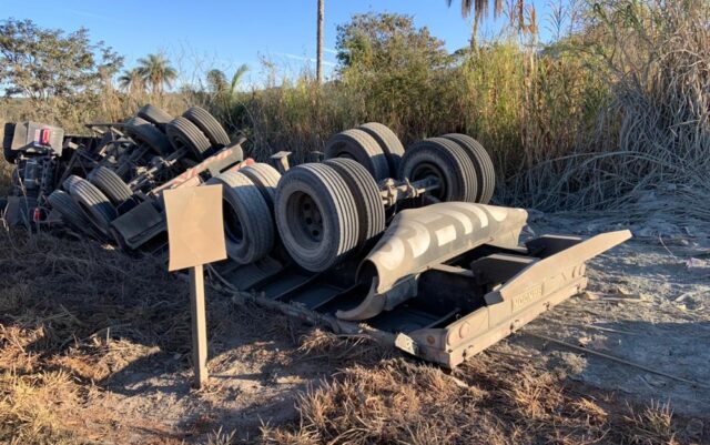 O veículo estava carregado com cimento e, após capotar, parou com as rodas para cima. O motorista ficou preso nas ferragens e morreu no local.