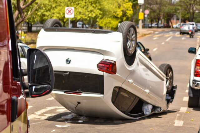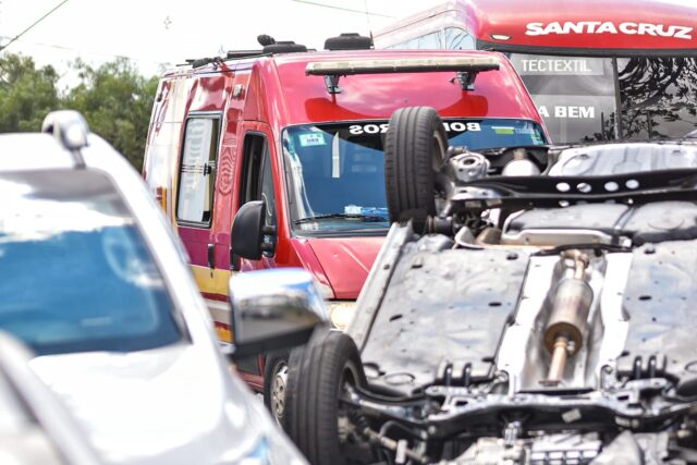 Segundo apuramos no local, um dos carros provocou o acidente ao passar por uma valeta, gerando a colisão e o capotamento.