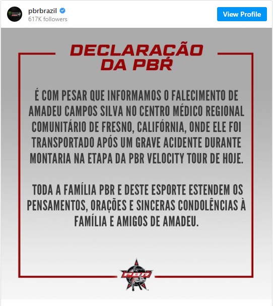 “É com pesar que informamos o falecimento de Amadeu Campos Silva no Centro Regional Comunitário de Fresno, na Califórnia, onde ele foi transportado após um grave acidente durante montaria na etapa da PBR Velocity Tour”, informou a página brasileira Professional Bull Riders (PBR).