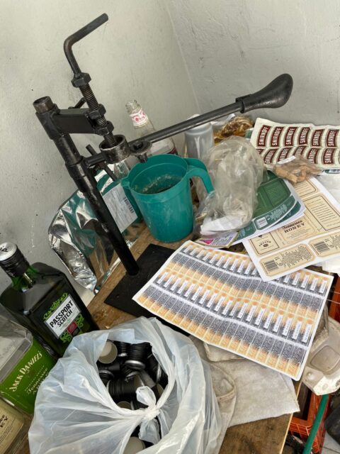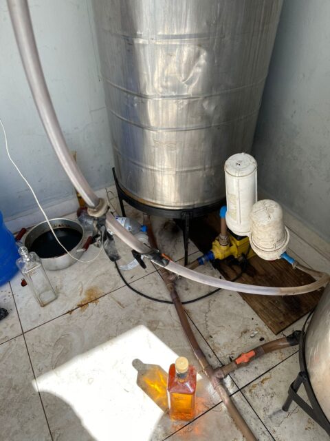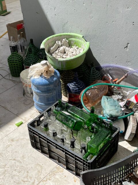No quintal da residência, os policiais constataram que ali funcionava um laboratório de falsificação de bebidas destiladas, sendo localizadas diversas garrafas, rótulos, tampas, aparatos para filtragem e destilação dos líquidos, bomba, mangueiras, galões e grande quantidade de líquido falsificado em diversos galões de 20 litros, bem como nos grandes tonéis ali existentes.