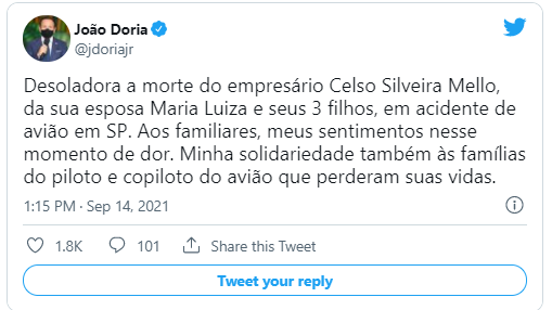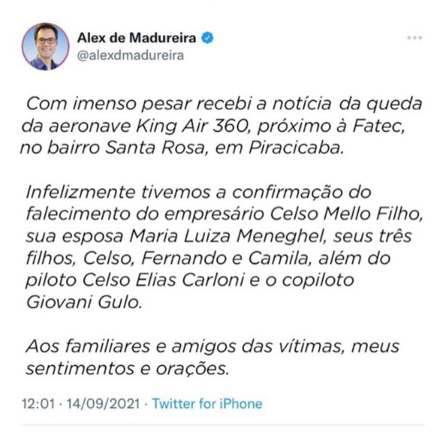 “Profundamente chocado com a tragédia ocorrida às 8h41 de hoje, quando o avião que levava o amigo Celso Silveira Mello Filho, a sua adorável esposa Maria Luiza, seus três filhos Fernando, Celsinho e Camila, além do piloto e co-piloto, caiu logo após a decolagem. Em 2016, tive a honra de homenageá-lo com o título de Piracicabanus Praeclarus, uma honraria que reconhece, em vida, todos aqueles que dedicam-se a engrandecer o nome da nossa cidade. Fica a saudade, a admiração e, acima de tudo, a gratidão pelo seu legado”, disse o vereador Pedro Kawai.