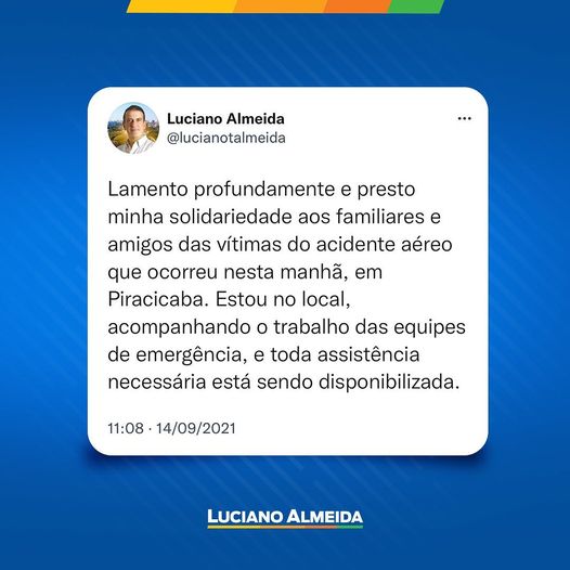 Políticos e entidades de Piracicaba (SP) se pronunciaram sobre o acidente aéreo que matou sete pessoas na manhã de hoje (14). Confira abaixo as notas publicadas por eles em suas redes sociais: