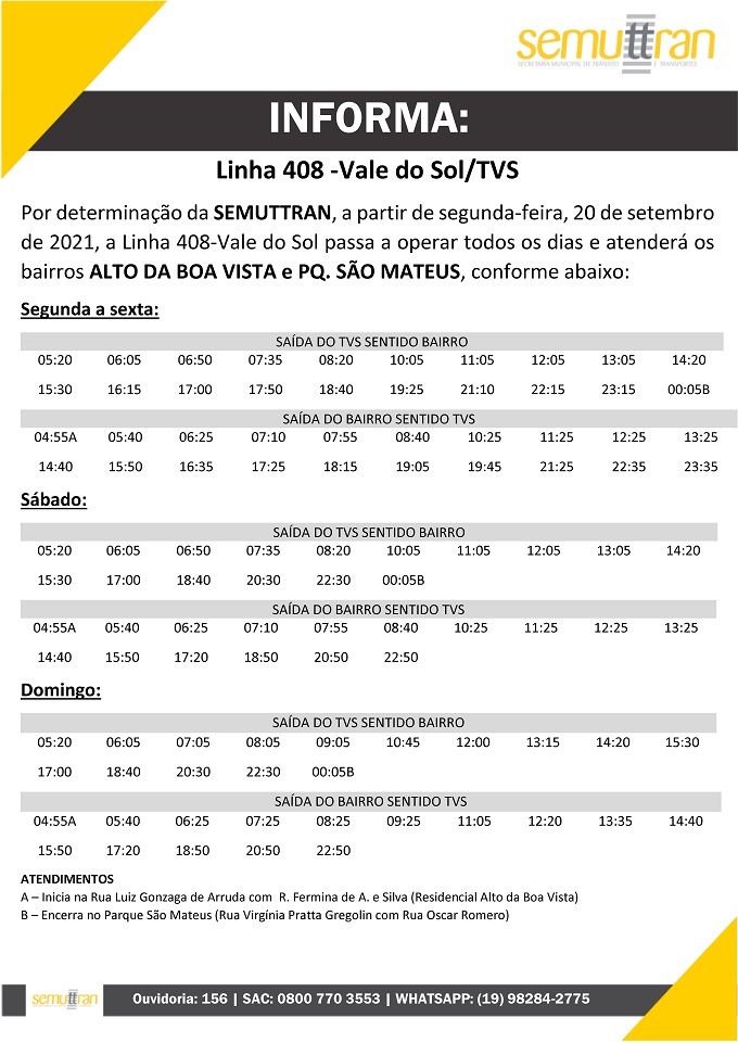 A partir de segunda-feira, 20/09, a nova linha de ônibus 408-Vale do Sol/TVS atenderá diariamente a população dos bairros Vale do Sol, Alto da Boa Vista, Parque das Águas e Parque São Matheus até o Terminal Vila Sônia.