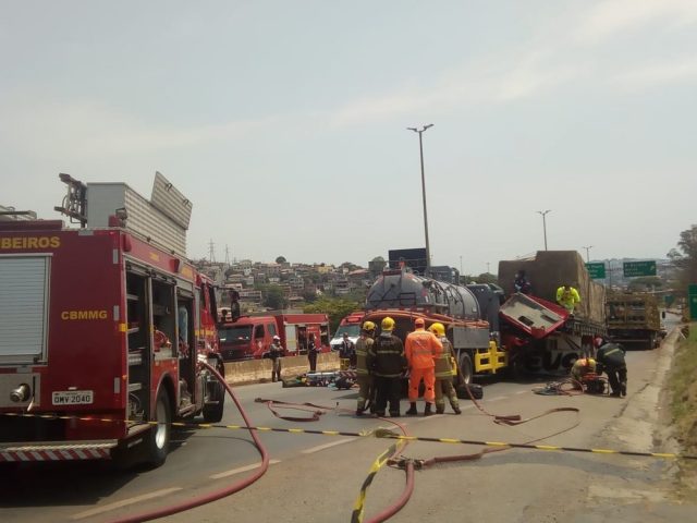 Um grande número de socorristas e um helicóptero dos Bombeiros foram mobilizados na manhã de hoje (27), para socorrer vítimas de uma colisão entre duas carretas no Anel Rodoviário, na altura do bairro Betânia, em Belo Horizonte.