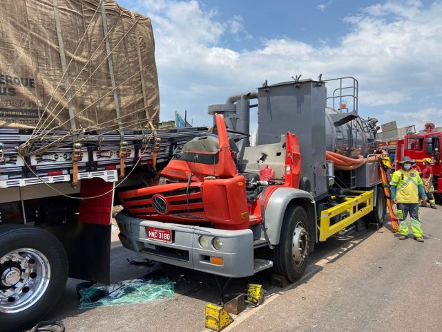 De acordo com a Polícia Militar Rodoviária, o caminhão-tanque de uma empresa desentupidora perdeu o freio e acabou colidindo na traseira de outro veículo pesado.