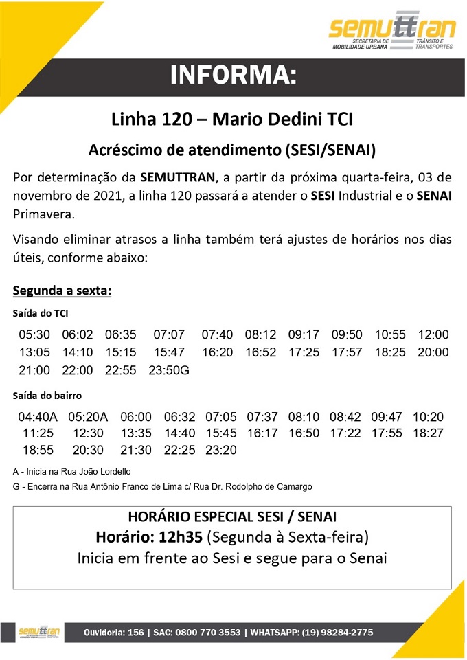 A partir desta quarta-feira (03) a linha de ônibus 120-Mário Dedini/Terminal Central de Integração-TCI, passará a atender o Sesi-Industrial e o Senai-Primavera, no horário das 12h35, de segunda à sexta-feira. A saída do ônibus será em frente ao Sesi, seguindo para o Senai.