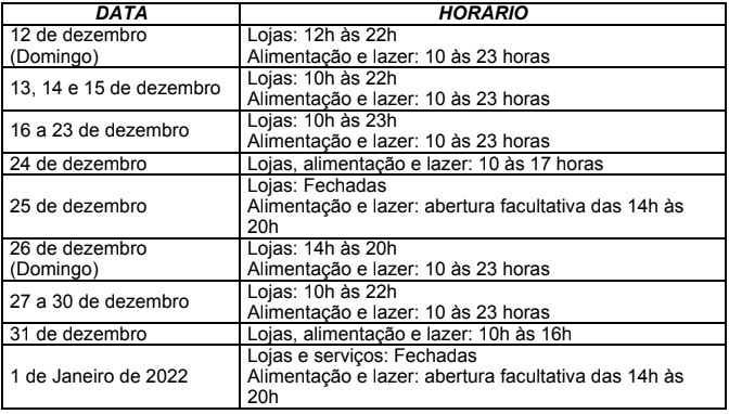 De 9 a 24 de dezembro: segunda a sexta-feira: das 09h às 22h; sábados – 11 e 18 de dezembro: das 09h às 18h; domingos – 12 e 19 de dezembro: das 09h às 17h; 24 de dezembro: das 09h às 18h e 31 de dezembro: das 08h às 15h.