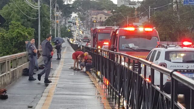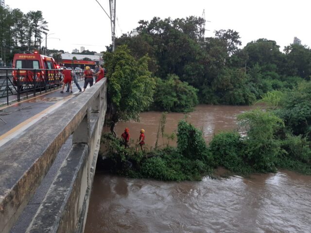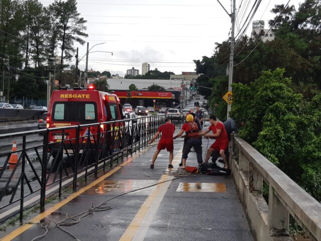 Acionados, os bombeiros usaram uma corda para amarrá-lo e puxá-lo para cima da ponte da Vila Rezende. Ele passa bem, embora o susto. O trânsito no local está intenso no sentido Centro.