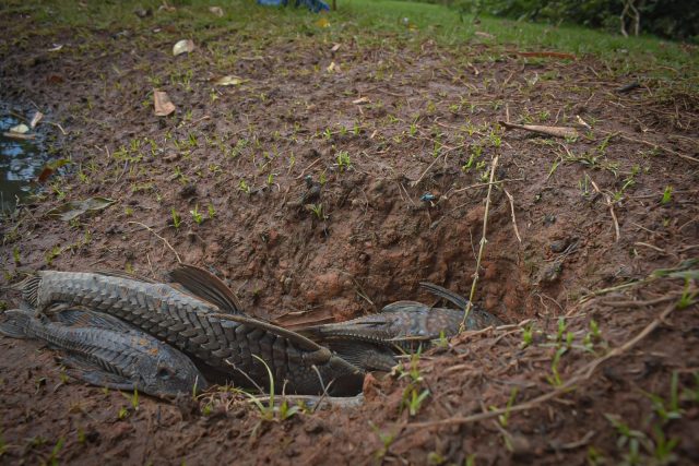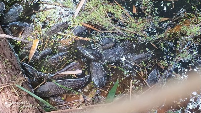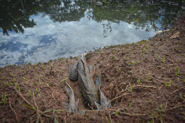Constatou-se que a várzea apresentava características de eutrofização e, de acordo com a informações dos moradores, possui baixa profundidade, assim, a decomposição da matéria orgânica, acelerada pela alta temperatura da água (>20,00°C) contribuiu para perda do oxigênio dissolvido, que culminou com a morte dos peixes.