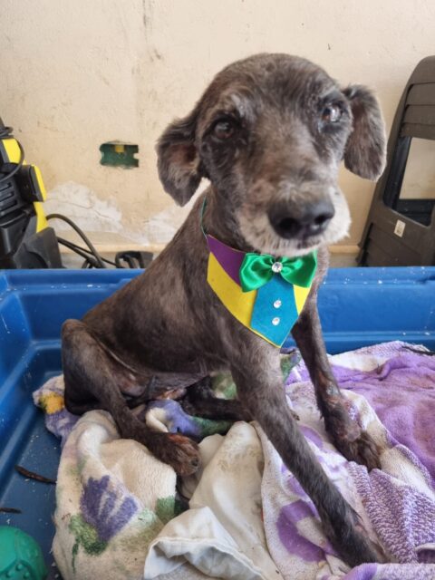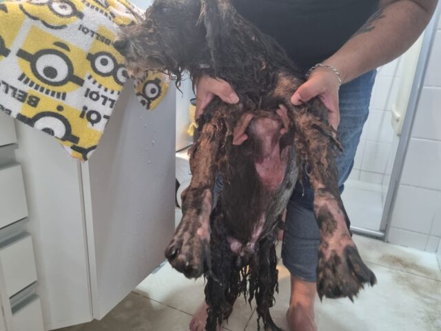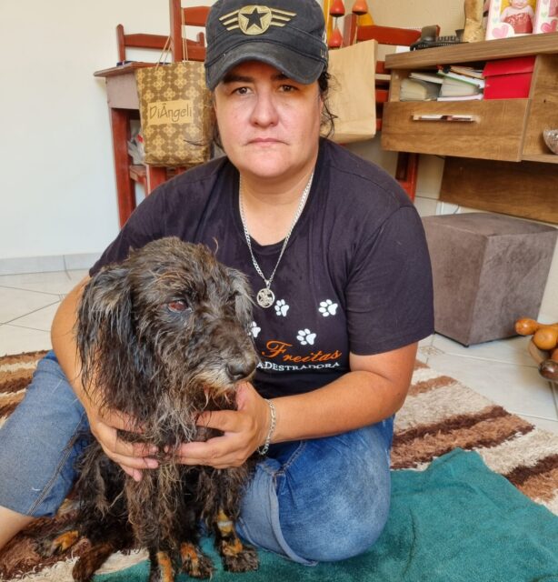 O cachorro foi resgatado com diversos ferimentos e recebeu os cuidados de Thaty Duda. Na manhã de hoje (14), a protetora contou que o Bidu já havia tomado banho e tosado.