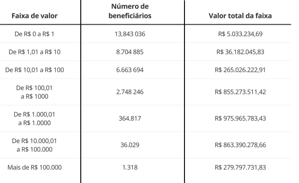 O Banco Central esclareceu ainda que “a quantidade total na tabela (32,3 mil) é superior ao total de CPFs beneficiados (27,3 mil) porque um mesmo CPF pode ter mais de um valor a receber”.