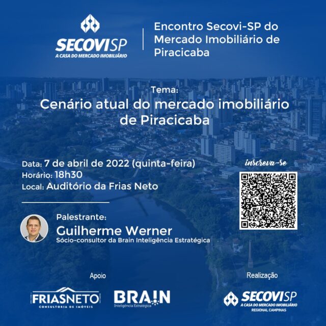 A Frias Neto Consultoria de Imóveis receberá no dia 07 de abril, a partir das 19h, o Encontro do Mercado Imobiliário de Piracicaba, promovido pelo Secovi-SP. A programação, voltada para incorporadores, loteadores e corretores de imóveis associados e profissionais da área imobiliária, contará com palestra de Guilherme Werner, sócio-consultor da Brain Inteligência Estratégica. As inscrições estão abertas no link: https://bit.ly/encontro_secovi_piracicaba