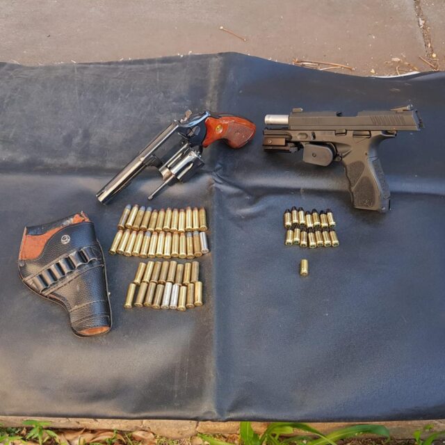 Ainda segundo o BAEP, após os tiros, o homem voltou para dentro do imóvel, pegou algumas roupas, e foi para a casa dos pais, que moram em frente. Lá os policiais encontraram as armas, mira a laser e munições escondidas em várias partes da casa como, por exemplo, dentro de uma churrasqueira, atrás de uma máquina de lavar roupas e no telhado.
