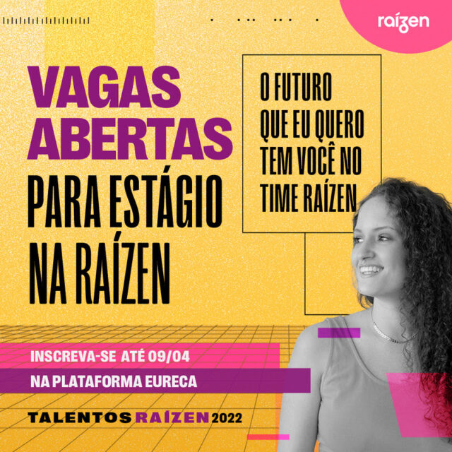 Com o mote “O FUTURO QUE EU QUERO”, esta edição do Programa Talentos Raízen é pensada para pessoas de atitude, que queiram redefinir o futuro da energia junto com a companhia. Referência global em bioenergia e com um ecossistema integrado de negócios, a Raízen oferece benefícios que vão além das expectativas de quem está começando a carreira ou buscando novas experiências, com remuneração competitiva e trilhas de desenvolvimento profissional.