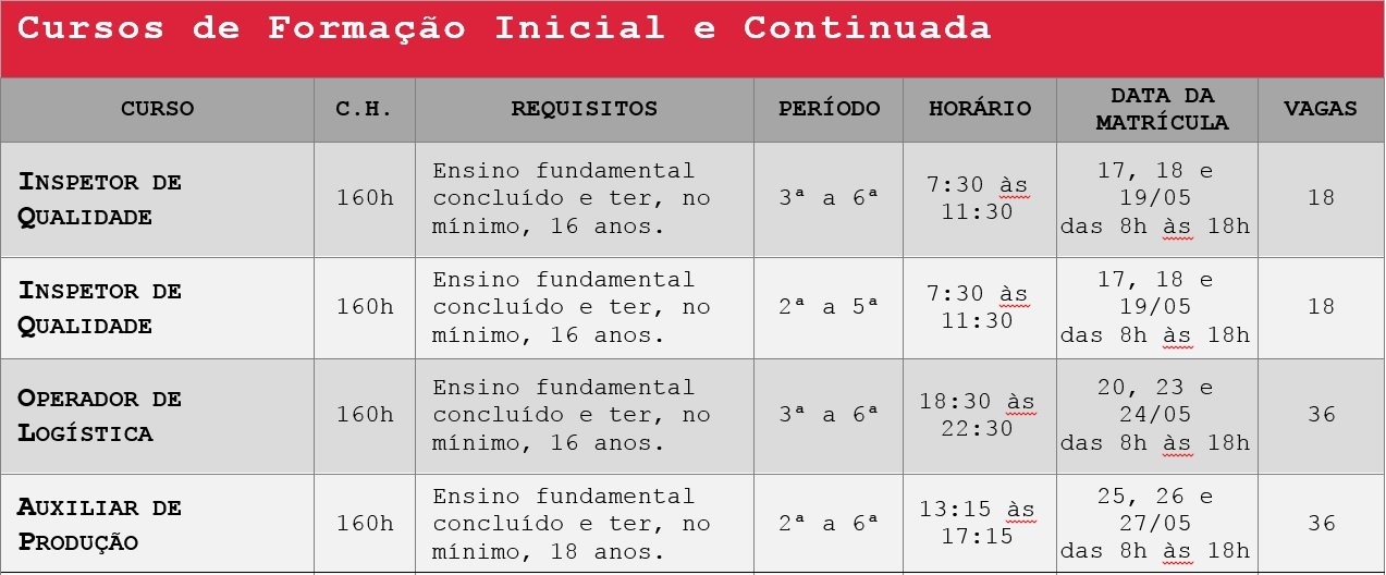 A Escola Senai Mário Dedini está com inscrições abertas para três cursos de qualificação com bolsa de estudo integral. São 36 vagas para curso Inspetor de Qualidade, 36 vagas para Operador de Logística e 36 para Auxiliar de Produção. É a oportunidade para adquirir uma formação profissional inteiramente gratuita. Aproveite e faça sua matrícula hoje mesmo! Confira abaixo todas as informações: