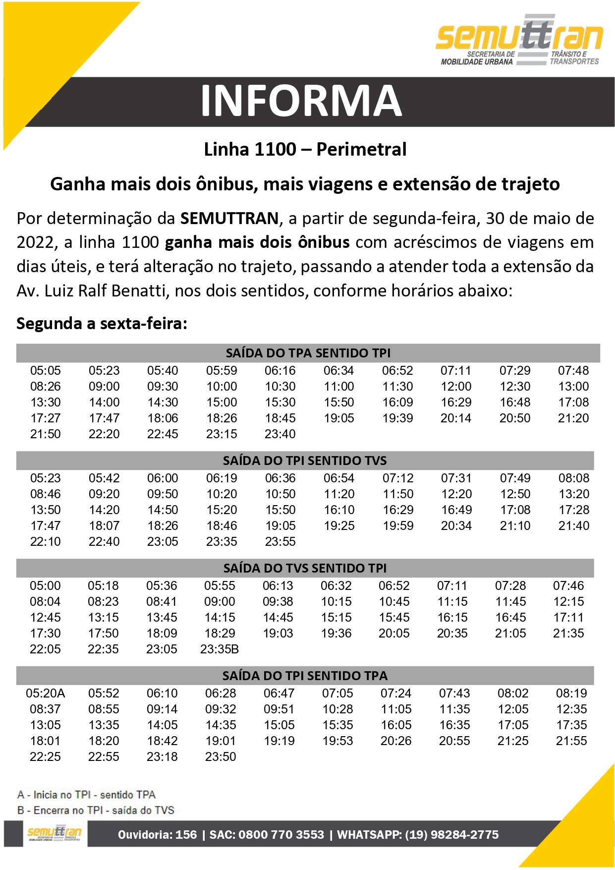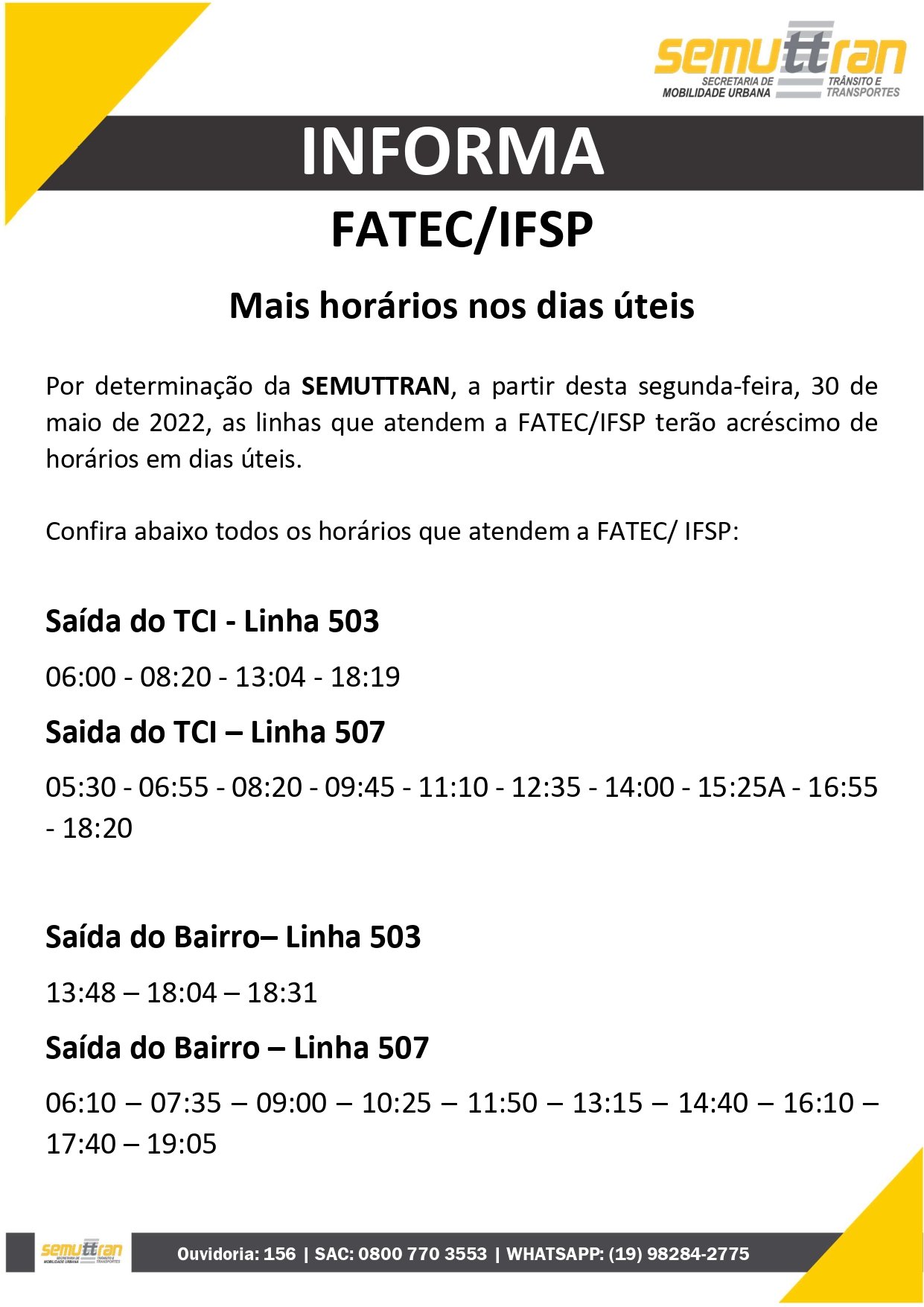 A Prefeitura de Piracicaba, por meio da Secretaria Municipal de Mobilidade Urbana, Trânsito e Transportes (Semuttran), ampliou horários das linhas 503 – Santa Rosa, 1100 – Perimetral e Fatec/IFSP a partir de hoje (30). Os horários podem ser conferidos no site da empresa TUPi (https://www.tupitransporte.com.br/linhas-e-horarios).