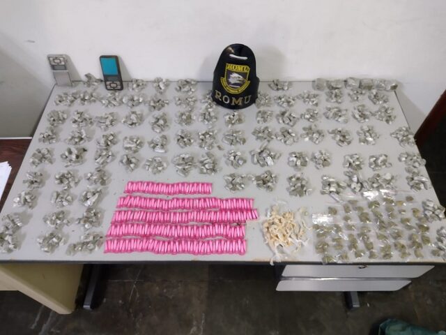 A equipe, formada pelos GCs Everton, Cavalcante, Bottene e Macedo, avistou duas pessoas embalando entorpecentes para venda em área verde do bairro, na Rua Lurdes Luzia Pinto. Os indivíduos, ao perceberem a viatura, fugiram do local e não foi possível detê-los. Os entorpecentes, porém, foram deixados no local.