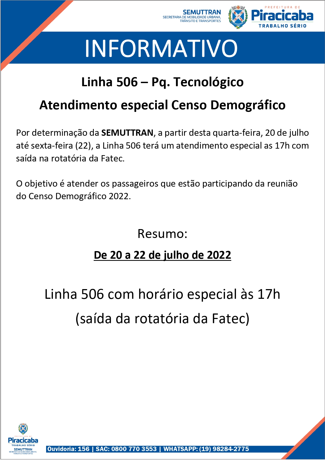 A Prefeitura, por meio da Secretaria Municipal de Mobilidade Urbana, Trânsito e Transportes (Semuttran), determinou horário especial na linha 506 – Parque Tecnológico, de hoje, quarta-feira (20) até sexta-feira (22), às 17h, com saída na rotatória da Fatec.