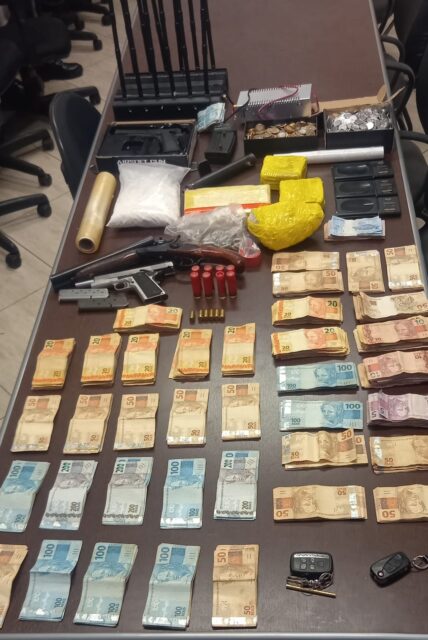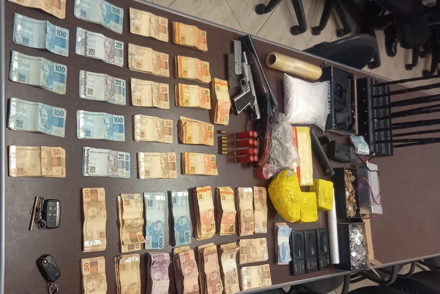 Em continuidade ao cumprimento de mandado na residência de um dos presos, localizada no bairro Pau Queimado, os policiais encontraram e apreenderam duas armas, sendo uma pistola com seis munições e dois carregadores, e uma espingarda com oito cartuchos intactos. Também foram apreendidos R$ 6.775 em dinheiro no local.