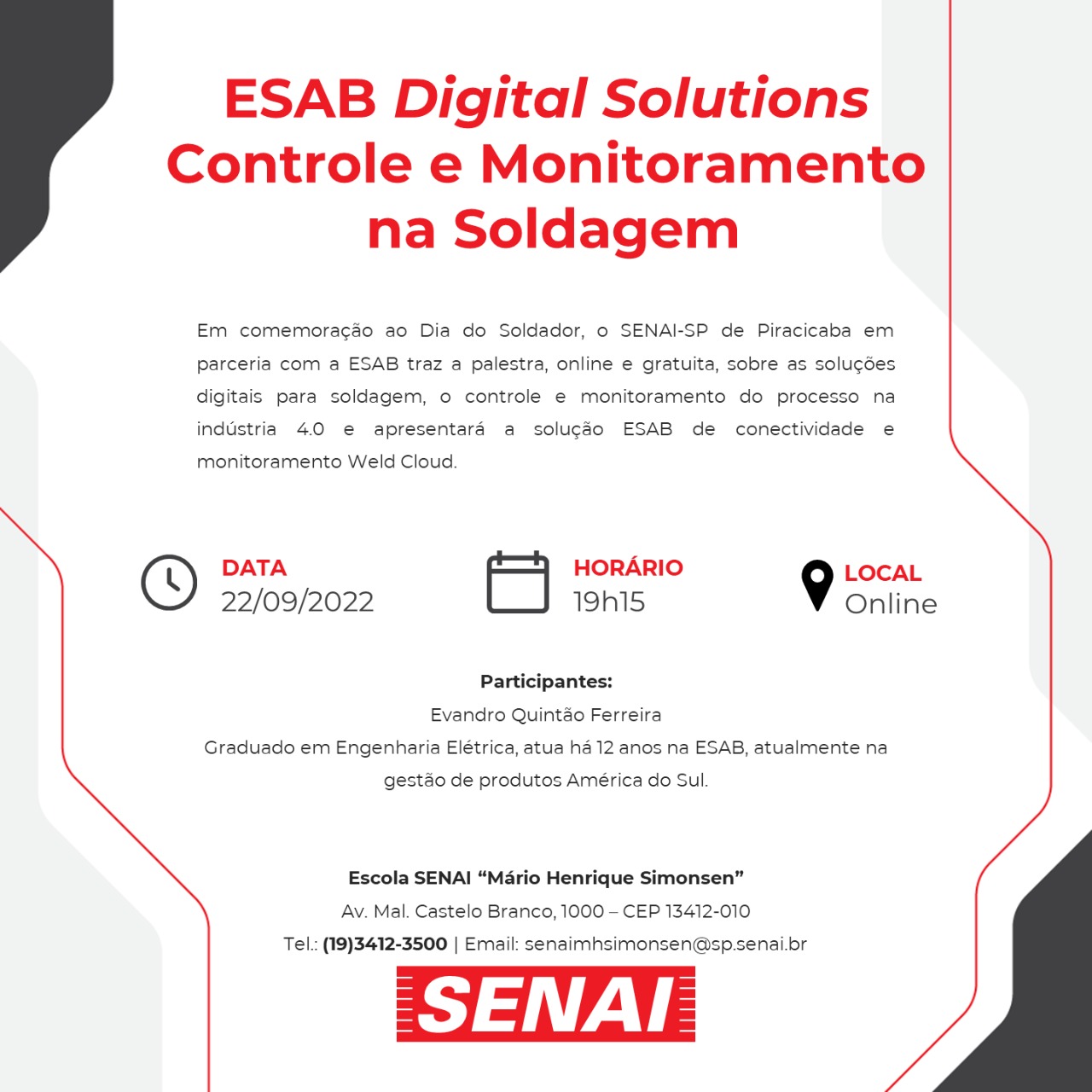 Em comemoração ao Dia do Soldador, o Senai “Mário Henrique Simonsen” (Senai Vila) de Piracicaba em parceria com a ESAB traz a palestra online e gratuita sobre as soluções digitais para soldagem, controle e monitoramento do processo na indústria 4.0, e apresentará a solução ESAB de conectividade e monitoramento Weld Cloud.