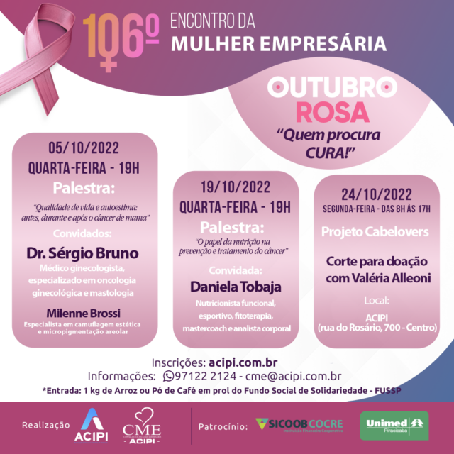 Em 2022, estima-se que ocorrerão 66.280 casos novos de câncer de mama no Brasil, segundo o Instituto Nacional do Câncer (Inca). Com o objetivo de lembrar sobre a importância da prevenção e do diagnóstico precoce da doença, o CME (Conselho da Mulher Empreendedora) da ACIPI (Associação Comercial e Industrial de Piracicaba) realiza três eventos em alusão ao Outubro Rosa.