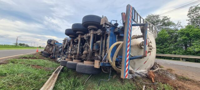 O caminhão levava 25 toneladas de uma matéria-prima para produção de plástico. Uma faixa da pista precisou ser interditada porque parte do veículo ficou sobre ela.