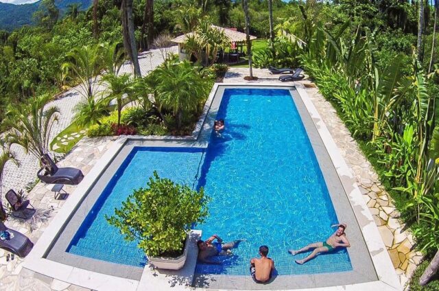 A pousada fica a 800 metros do Centro Histórico e do Pier de onde saem os passeios de barco de Paraty e é cercado por verde. Conta ainda com suítes com ar condicionado, TV, frigobar, secador de cabelo wifi, piscina, salas de jogos e mais.