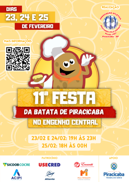 O Engenho Central recebe nos dias 23, 24 e 25 de fevereiro, a 11ª edição da Festa da Batata, a partir das 18h. A festividade realizada pela Associação Atlética Educando pelo Esporte – AAEPE conta com a participação de aproximadamente 300 voluntários.